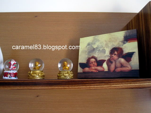 Bu da duvar rafimiz.. Melek köşesi! Cam küreleri yilbaşi sofram için almiştim, herkesin tabağinin yanina o geceden bir hatira olsun diye koyuvermiştim =) Şimdi kankalarin evine gidip de bu cam küreleri etrafta gördükçe çok hoşuma gidiyor =)